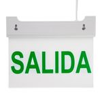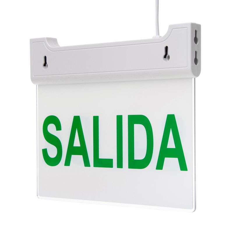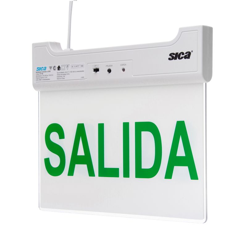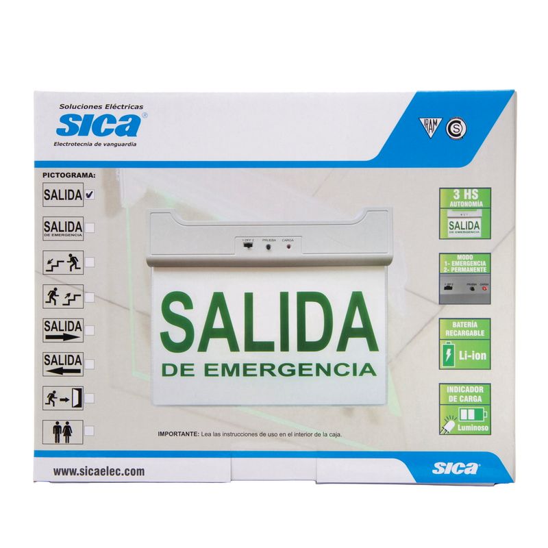 Los señalizadores luminosos son elementos de seguridad edilicia básicos ya que indican las vías de salida ante una situación de emergencia, aunque también son útiles en situación cotidiana. Su diseño compacto lo hace adaptable a cualquier tipo de estética ambiente. Son aptos para ser usados en edificios de viviendas, hospitales, fabricas, etc. Los señalizadores SICA cuentan con una batería de Litio recargable que mantiene los LEDs encendidos ante el corte de energía. Su autonomía es de 3hs. Doble faz: Dado su fondo blanco, los pictogramas se encuentran a un lado y otro del cartel, haciéndolo adaptable en su montaje. Funcionamiento: -Conecte el cartel a la red de energía eléctrica. El indicador de carga debe encenderse. -Cargue la batería por al menos 24 hs antes de su primer uso. Esquema de conexión: -El Señalador luminoso posee un interruptor de 3 posiciones, seleccione el modo deseado: 1.-Emergencia: el señalador se encenderá si hay un corte de suministro de energía eléctrica, si la batería tiene carga. 2.-Permanente: el señalador permanece encendido si hay suministro de energía eléctrica. Ante un corte de energía, los LEDs se encenderán si la batería tiene carga. OFF: El señalador permanece apagado. Indicador de carga: El cartel de salida posee un indicador de carga luminoso que permanece encendido mientras haya suministro de energía eléctrica. Botón de prueba: Al presionarlo simula un corte de suministro de energía. Si el interruptor se encuentra en la posición 1, los LEDs se encenderán. Montaje: Basta con instalar dos tornillos, ya sea en techo o pared. Incluye tarugos y tornillos.