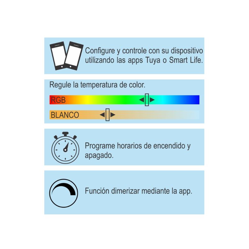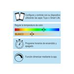 Permite controlar la iluminación desde el celular mediante conexión Wi-Fi, sin necesidad de hub adicional. Compatible con las aplicaciones Tuya Smart y Smart Life, ofrece control total de intensidad, temperatura de color y colores RGB para crear ambientes personalizados en cualquier espacio.