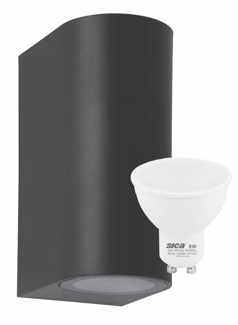 Aplique bidireccional para montaje superficial con 2 lámparas LED de 6W incluidas (reemplazables), en versión Luz día (6500K) o Blanco cálido (3000K). Posee portalámpara cerámico, cuerpo de plástico y difusor de vidrio. Incluye tornillos y tarugos para su montaje.
