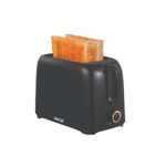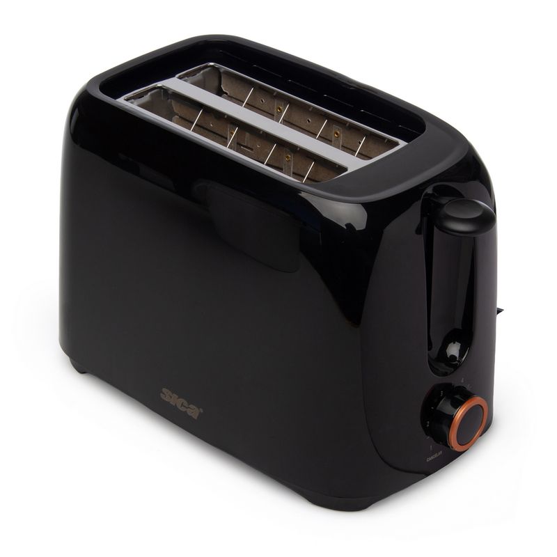 Tostadora eléctrica para pan (tipo lactal). Cuenta con perilla para regular el nivel de tostado o cancelar, y palanca para cargar y extraer el pan. Incorpora bandeja recolectora de migas para una limpieza sencilla.